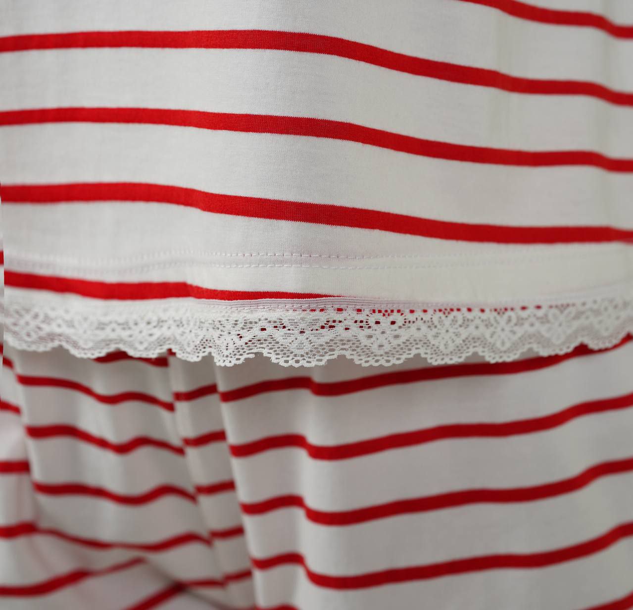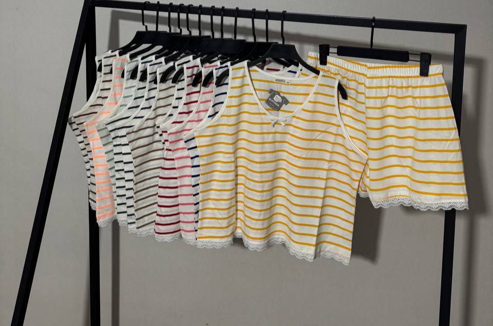 نقطه قوت اصلی این ست طراحی پارچه راه راه روی زمینه سفید است که باعث میشود لباس همیشه تمیز، مرتب و شاد دیده شود. خطوط رنگی باعث میشوند استایل از سادگی بیش از حد خارج شود ولی همچنان مینیمال بماند.